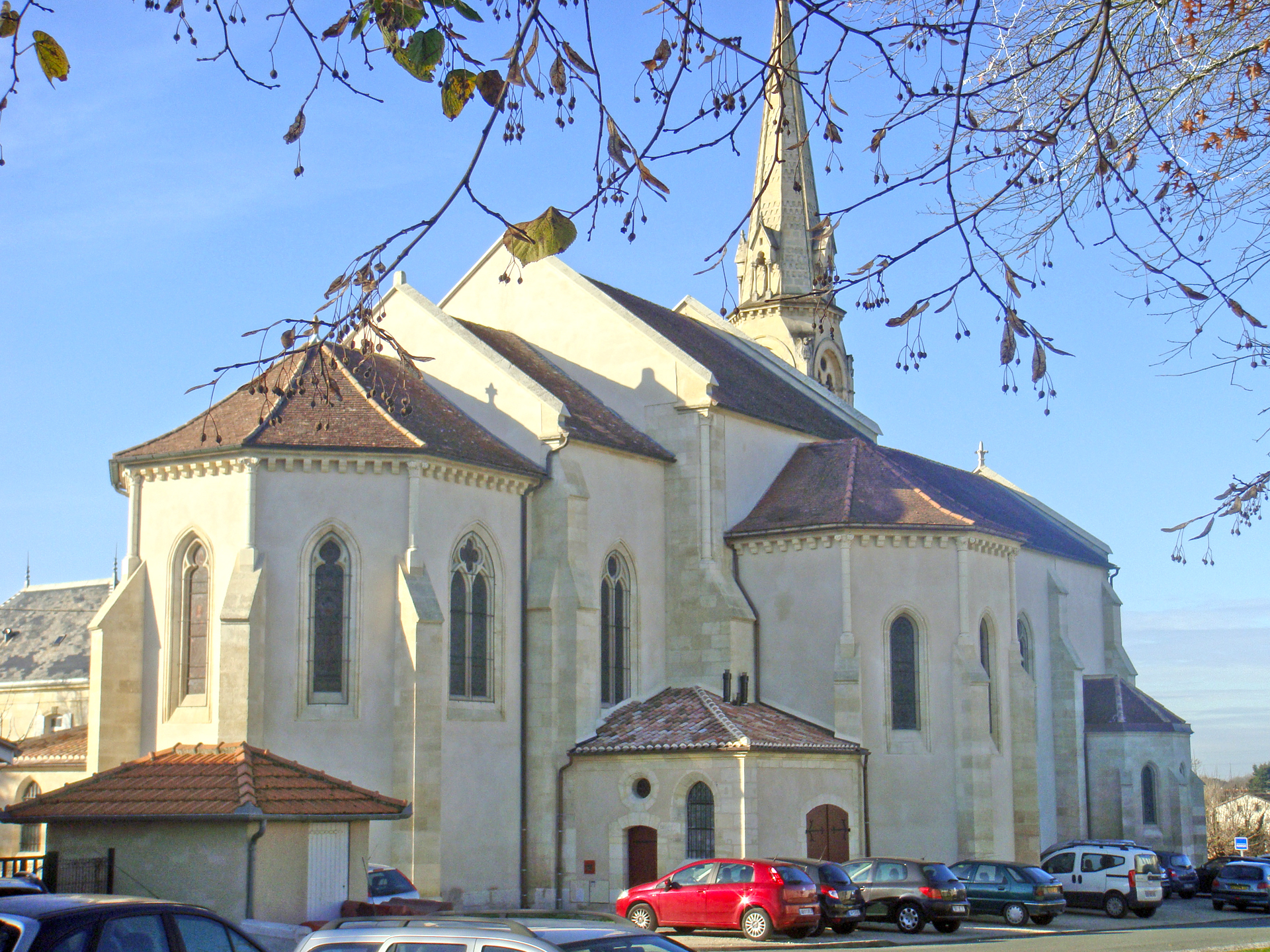 Construite en 1864 par l'architecte Gustave Alaux, cette église date entièrement du XIXème siècle. Le seul élément ancien et daté que nous avons retrouvé dans l'église est une statue de la Vierge Marie marquée "1827 Minquini fecit Bordeaux" . Le clocher, le porche et les fonts baptismaux datent eux de 1870. L'ensemble de l'édifice, a depuis, été l'objet de plusieurs campagnes de restauration, décrites dans l'étude établie en juin 2006 par notre confrère J.L. Montarnier. La commune et le conseil paroissial souhaitent que soit établi un diagnostic général et complet de cet édifice. L'étude de l'édifice et les relevés sur place ont permis de définir plusieurs axes d'interventions tant en structure, avec le remplacement des tirants métalliques par des tirants en fibre de verre, que dans les décors intérieurs, avec la mise en valeur de l'autel majeur et la création d'un mobilier liturgique contemporain. Un chauffage a air pulsé en sol et un traitement par électro-osmose et enduits resistants aux sels ont également été installés.