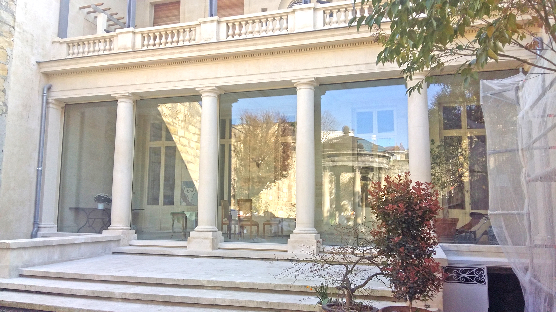 Les propriétaires actuels ont souhaité entreprendre des travaux de restauration sur la façade arrière et son jardin où la restitution des bassins et la restauration de l'élément de rocaille ont métaphorsé l'espace.