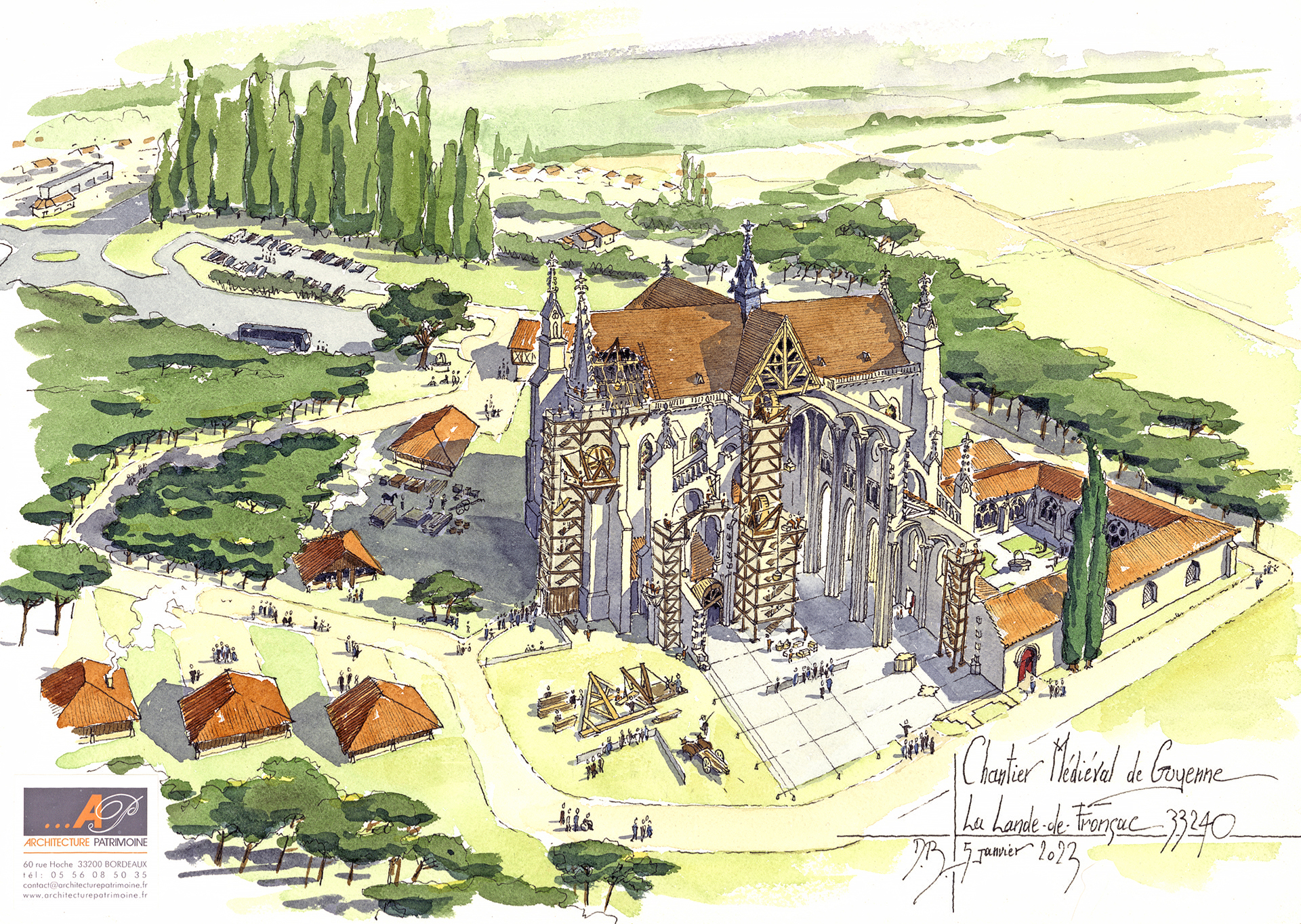 Le projet que s’est vu confié l’agence au printemps 2020 est un projet un peu fou : dessiner et construire une cathédrale avec des méthodes médiévales. Le maitre d’ouvrage, Valery OSSENT, ingénieur ESTP, entouré de son conseil de fabrique nous a missionné pour ce défi, un brin utopique, dans les pas des chantiers de l’Hermione ou du château de Guédelon.